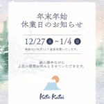 年末年始の休業日のお知らせ 2025.12.08 お知らせ 2025年もあっという間に12月ですね、、、 年末年始は12/27(土)から1/4(日)まで休業させていただきます 期間中にいただきましたHPからのお問い合わせにつきましては、 … 詳しくはこちら